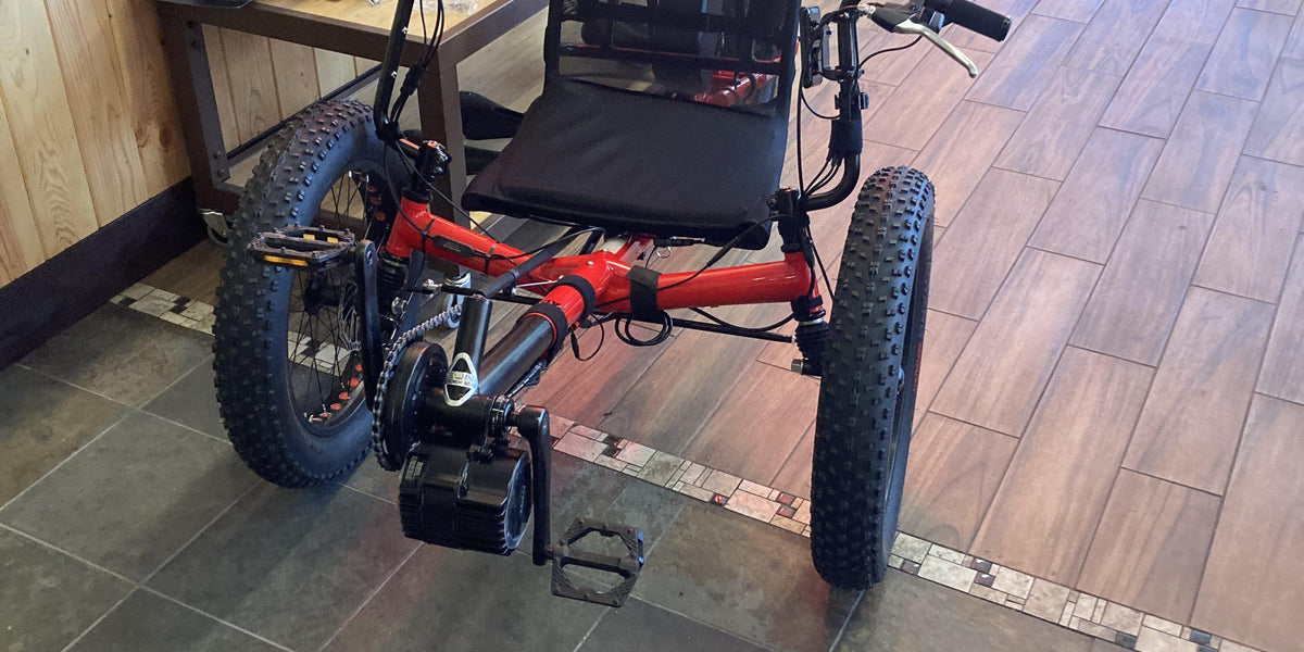 ELECTRIC Sun Seeker Fat-Tad Recumbent Trike with 1000w BBSHD Mid-Drive. This Voltaire build will power up most grades with throttle only.