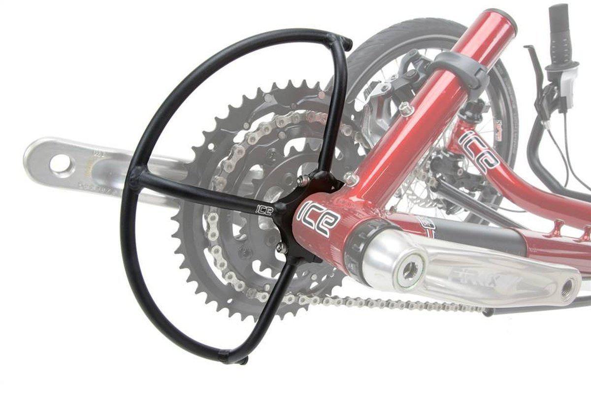 Designed by ICE, this optional chain ring guard is a light-weight and durable unit made from heat treated aluminum alloy. The guard is an added safety feature but is also very good in preventing you from accidentally brushing against the oily chain rings and avoiding the tell-tale prints on your legs or trousers.