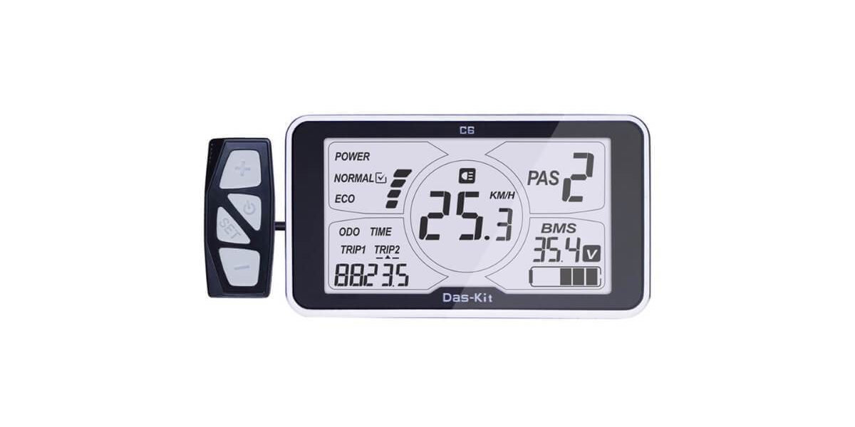 - Readouts: Power (Current), Battery Level (6 Bars), Speed, Assist Level (0-6), Odometer, Trip Distance, Trip Time
