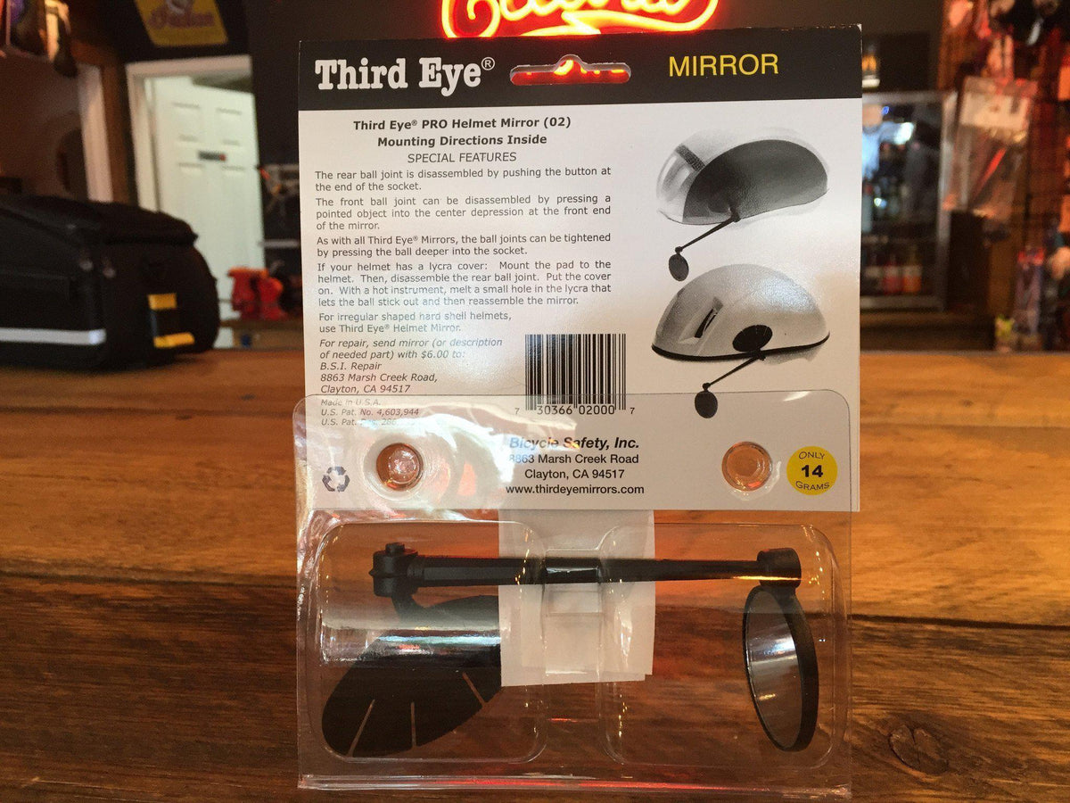 The Pro Mirror attaches to any helmet with an adhesive pad to offer an adjustable rear view.