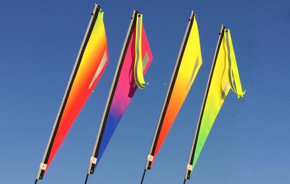 Super visible, super stylin' and super fun! These flags are superbly designed for both high performance and high style. The rakish aero shape is tuned for visibility, low drag, and just the right amount of attention getting back-and-forth waving. Highly visible under multiple lighting conditions and backgrounds, yet very stylish and something you can be proud to ride with. So pick your style, pick your colors and ride with pride!